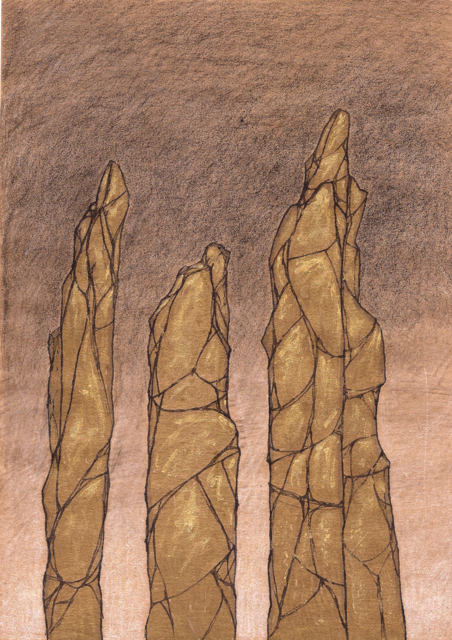 Técnica mixta: grafito, lápiz blanco, rotulador y témpera dorada sobre papel.